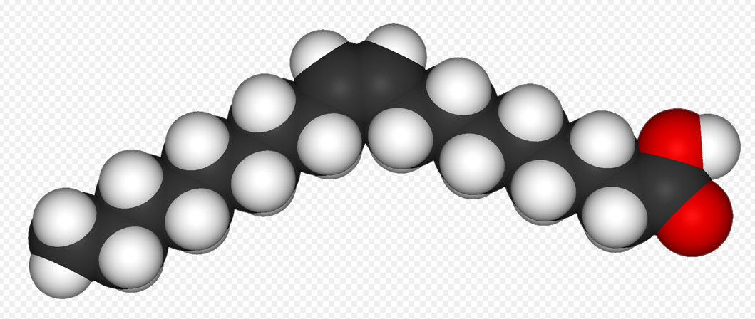 Common monounsaturated fatty acids are palmitoleic acid (16:1 n−7), cis-vaccenic acid (18:1 n−7) and oleic acid (18:1 n−9). Palmitoleic acid has 16 carbon atoms with the first double bond occurring 7 carbon atoms away from the methyl group (and 9 carbons from the carboxyl end). It can be lengthened to the 18-carbon cis-vaccenic acid. Oleic acid has 18 carbon atoms with the first double bond occurring 9 carbon atoms away from the carboxylic acid group. The illustrations below show a molecule of oleic acid in Lewis formula and as a space-filling model.