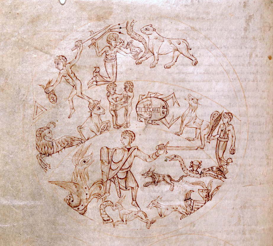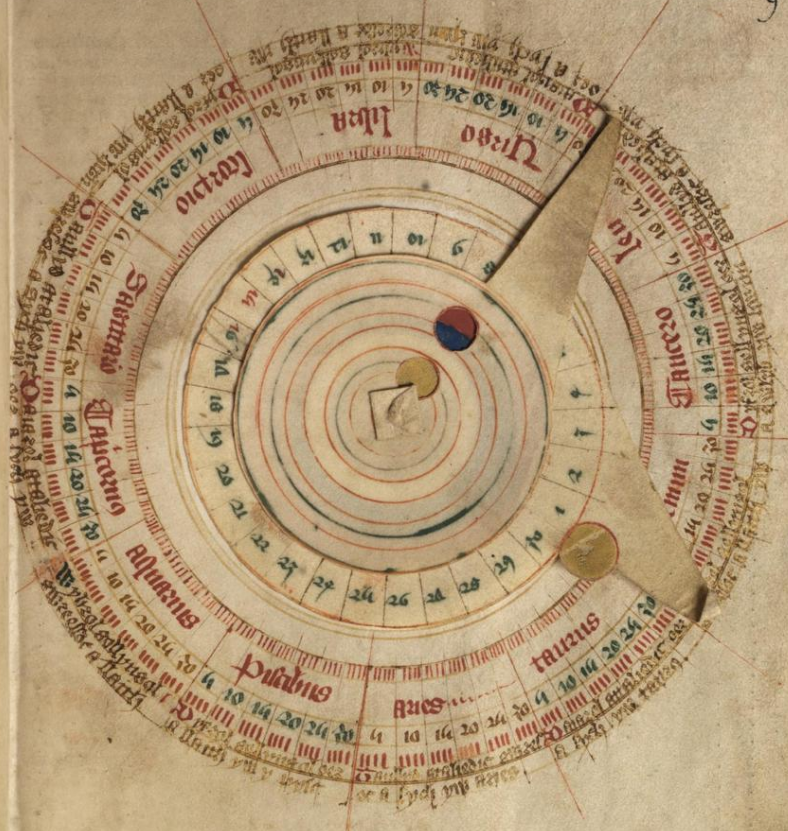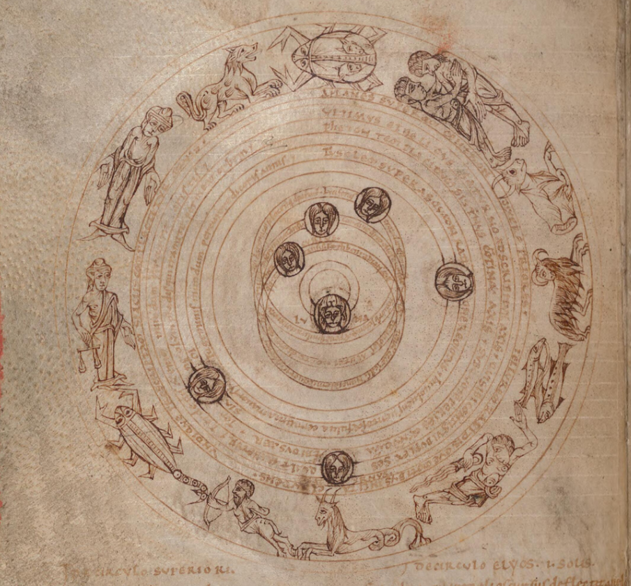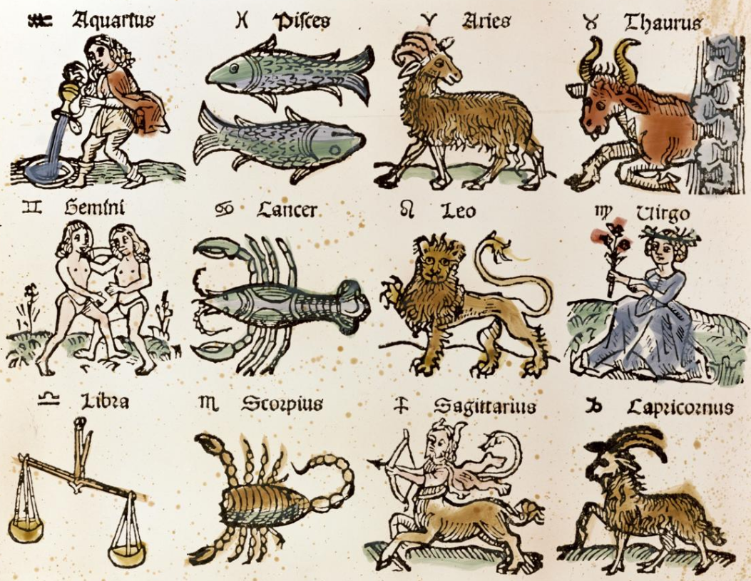 The zodiac symbols are Early Modern simplifications of conventional pictorial representations of the signs, attested since Hellenistic times.