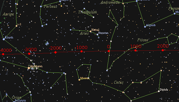 Due to the precession of the equinoxes, the time of year the Sun is in a given constellation has changed since Babylonian times, the point of March equinox has moved from Aries into Pisces.[12]