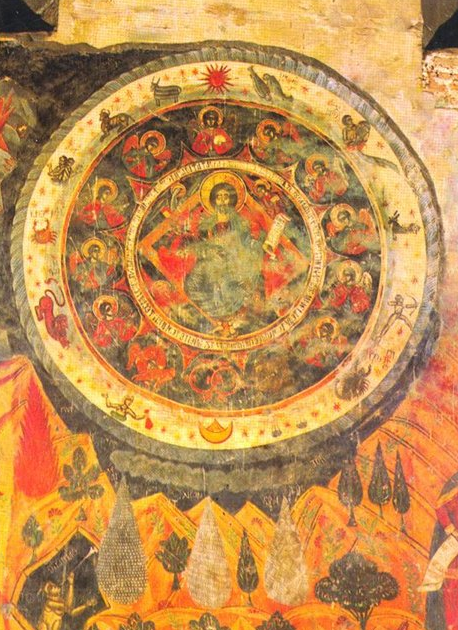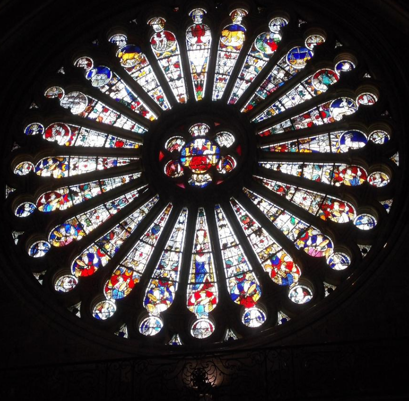 The zodiac is found in medieval stained glass as at Angers Cathedral, where the master glassmaker, André Robin, made the ornate rosettes for the North and South transepts after the fire there in 1451.[32]