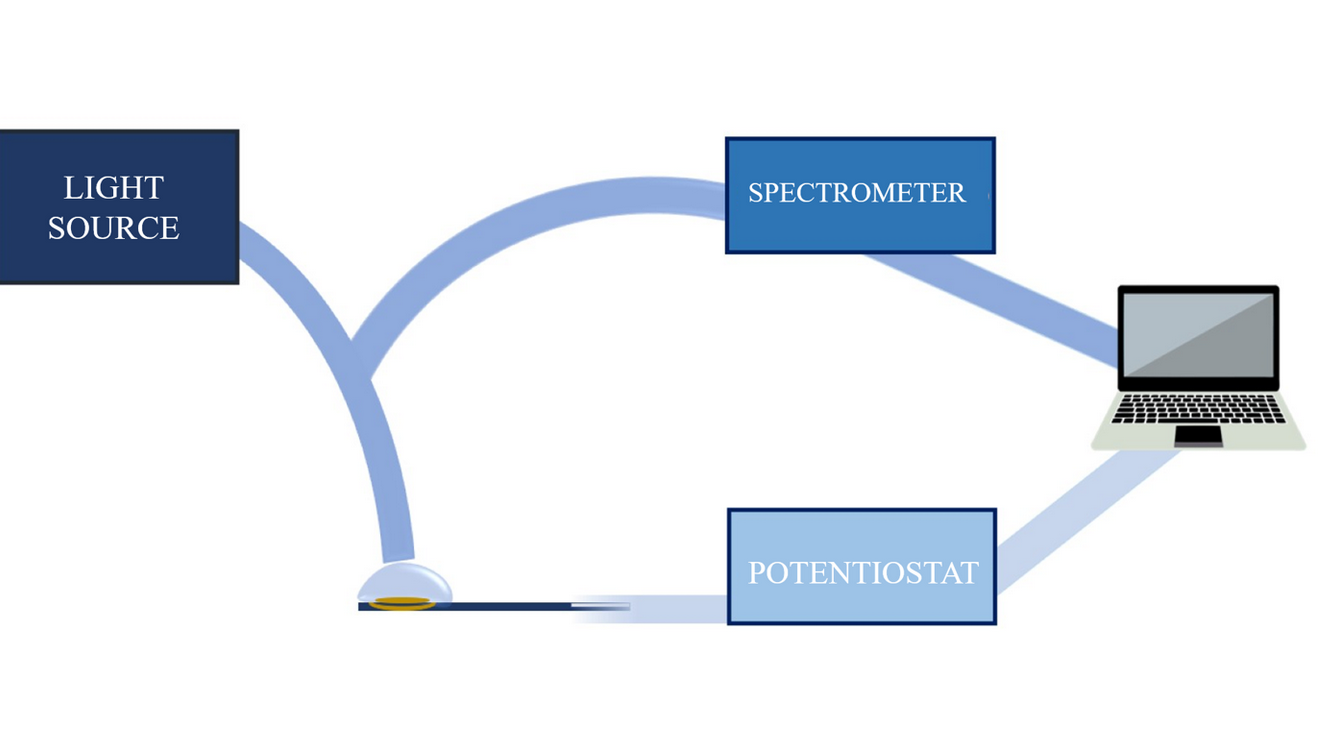 The light beam travels parallel to the working electrode surface, sampling the first micrometers of the solution adjacent to the working electrode surface, and collecting the information on the spectrometer.[2][4]