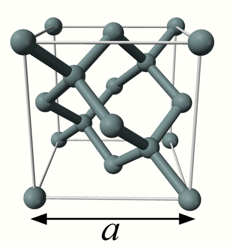 The unit cell of silicon has a cubic packing arrangement of 8 atoms, and the unit cell volume may be measured by determining a single unit cell parameter, the length of one of the sides of the cube, a.[34]