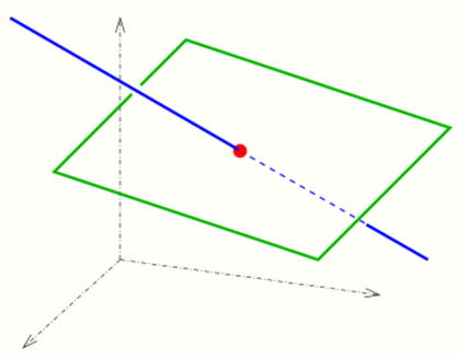 Commonly a line in space is represented parametrically [math]\displaystyle{ (x(t),y(t),z(t)) }[/math] and a plane by an equation [math]\displaystyle{ ax+by+cz=d }[/math]. Inserting the parameter representation into the equation yields the linear equation