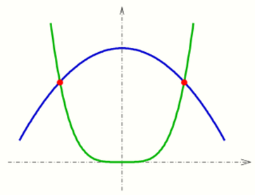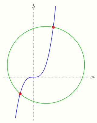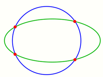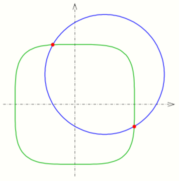 Two curves in [math]\displaystyle{ \R^2 }[/math] (two-dimensional space), which are continuously differentiable (i.e. there is no sharp bend), have an intersection point, if they have a point of the plane in common and have at this point