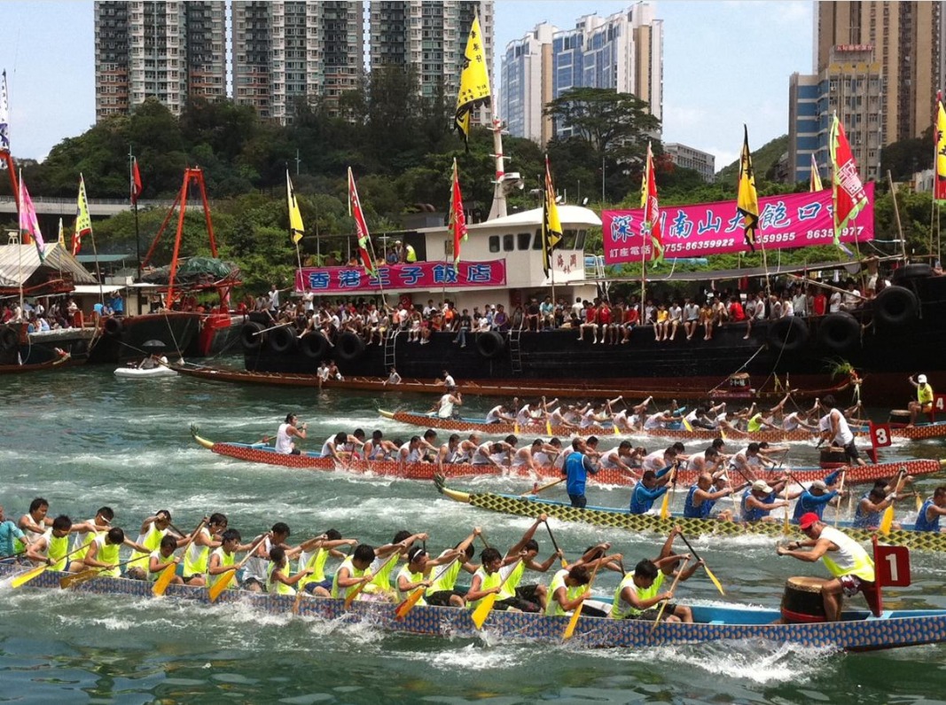 A dragon boat is a human-powered watercraft originating from the Pearl River Delta region of China 's southern Guangdong Province. These were made of teak, but in other parts of China, different kinds of wood are used. It is one of a family of traditional paddled long boats found throughout Asia, Africa, the Pacific islands, and Puerto Rico. The sport of dragon boat racing has its roots in an ancient folk ritual of contending villagers, which dates back 2000 years throughout southern China, and even further to the original games of Olympia in Ancient Greece . Both dragon boat racing and the ancient Olympiad included aspects of religious observances and community celebrations, along with competitions. Dragon boat racing has been a traditional Chinese paddled watercraft activity for over 2000 years and began as a modern international sport in Hong Kong in 1976. These boats are typically made of carbon fiber, fiberglass, and other lightweight materials. For competition events, dragon boats are generally rigged with decorative Chinese dragon heads and tails. At other times (such as during training), decorative regalia is usually removed, although the drum often remains aboard for drummers to practice. For races, there are 18-20 people in a standard boat, and 8-10 in a small boat, not including the steersperson (helm) and the drummer. In December 2007, the central government of the People's Republic of China added the Dragon Boat Festival, along with the Qingming and Mid-Autumn festivals, to the schedule of national holidays.