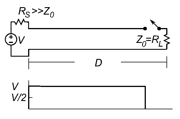 In a simple charged transmission line pulse generator (animation, right) a length of transmission line such as a coaxial cable is connected through a switch to a matched load RL at one end, and at the other end to a DC voltage source V through a resistor RS which is large compared to the characteristic impedance Z0 of the line.[1] When the power supply is connected it slowly charges up the capacitance of the line through RS. When the switch is closed, a voltage equal to V/2 is applied to the load, the charge stored in the line begins to discharge through the load a current of V/2Z0 and a voltage step travels up the line toward the source.[2] The source end of the line is approximately an open circuit due to the high RS,[1] so the step is reflected uninverted and travels back down the line toward the load. The result is that a pulse of voltage is applied to the load with a duration equal to 2D/c where D is the length of the line and c is the propagation velocity of the pulse in the line.[1] The propagation velocity in typical transmission lines is within 50% of the speed of light. For example, in most types of coaxial cable the propagation velocity is approximately 2/3 the speed of light, or 20 cm per nanosecond.
