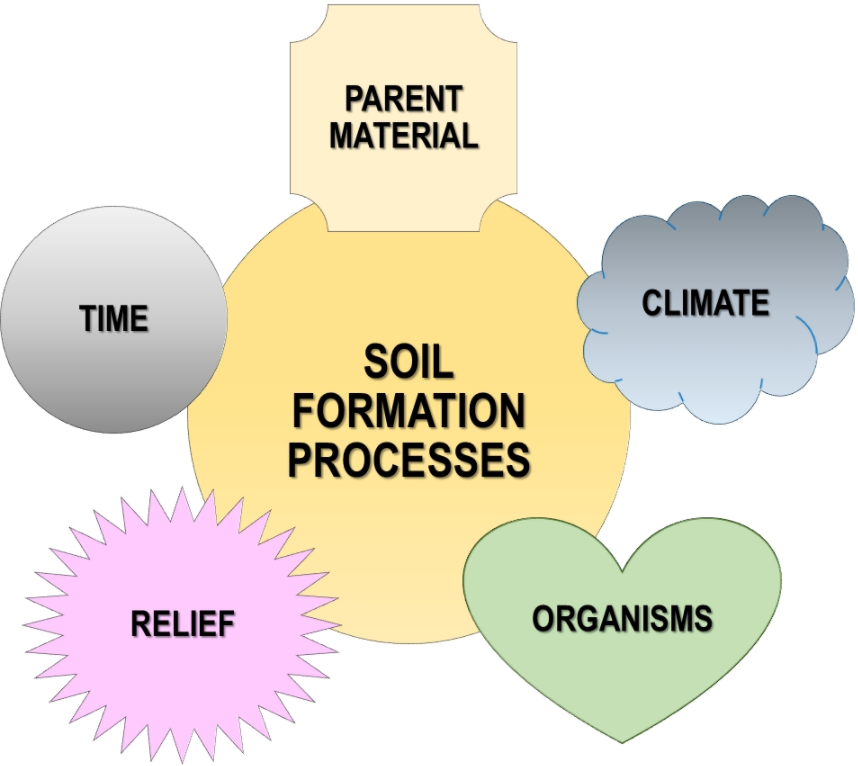 Soil formation is influenced by at least five classic factors that are intertwined in the evolution of a soil. They are: parent material, climate, topography (relief), organisms, and time.[8] When reordered to climate, relief, organisms, parent material, and time, they form the acronym CROPT.