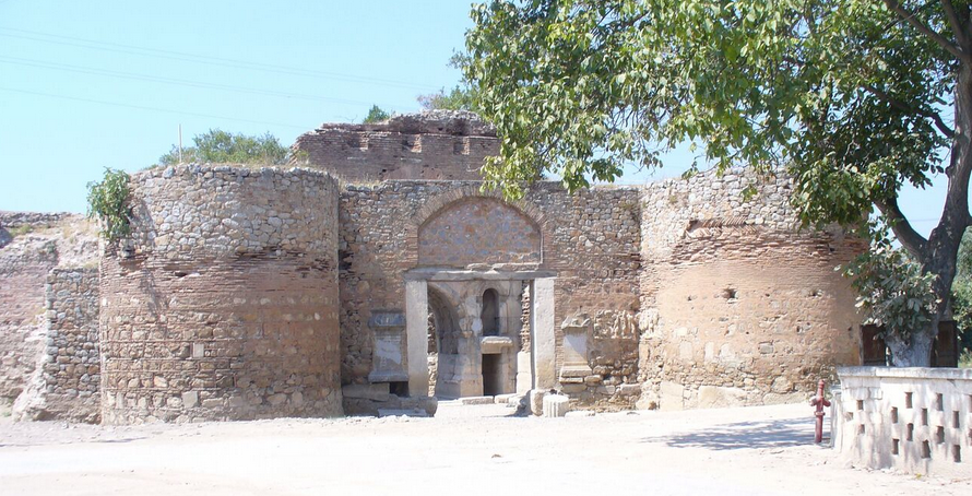 The ancient walls, with their towers and gates, are relatively well preserved. Their circumference is 3,100 m (10,171 ft), being at the base from 5 to 7 m (16 to 23 ft) in thickness, and from 10 to 13 m (33 to 43 ft) in height; they contain four large and two small gates. In most places they are formed of alternate courses of Roman tiles and large square stones, joined by a cement of great thickness. In some places columns and other architectural fragments from the ruins of more ancient edifices have been inserted. As with those of Constantinople, the walls seem to have been built in the 4th century. Some of the towers have Greek inscriptions.[9]