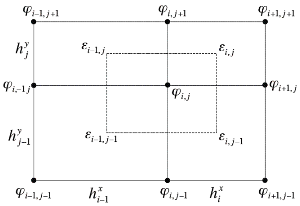 In this appendix it is assumed to be a two-dimensional case. Upgrading to a three-dimensional system would be straightforward and legitimate as the Gauss theorem is also valid for the one and three dimensions. [math]\displaystyle{ \epsilon }[/math] is assumed to be given on the rectangular regions between nodes, while [math]\displaystyle{ \varphi }[/math] is defined on the grid nodes (as illustrated on figure at the right).