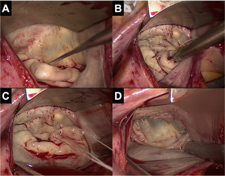 Figure 4. View on the mitral valve in MIMVS. A. Prolapse of P2 segment B. Placement of neochords on the prolapsing segment C. Adjusting of the height of the neochords D. Result of mitral valve repair