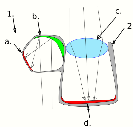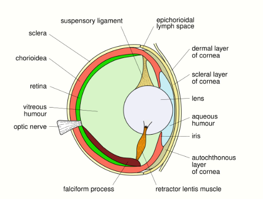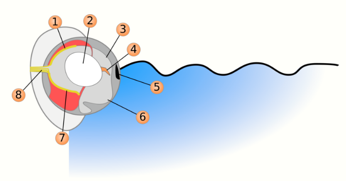 Once light passes through the lens, it is transmitted through a transparent liquid medium until it reaches the retina, containing the photoreceptors. Like other vertebrates, the photoreceptors are on the inside layer so light must pass through layers of other neurons before it reaches them. The retina contains rod cells and cone cells.[1]