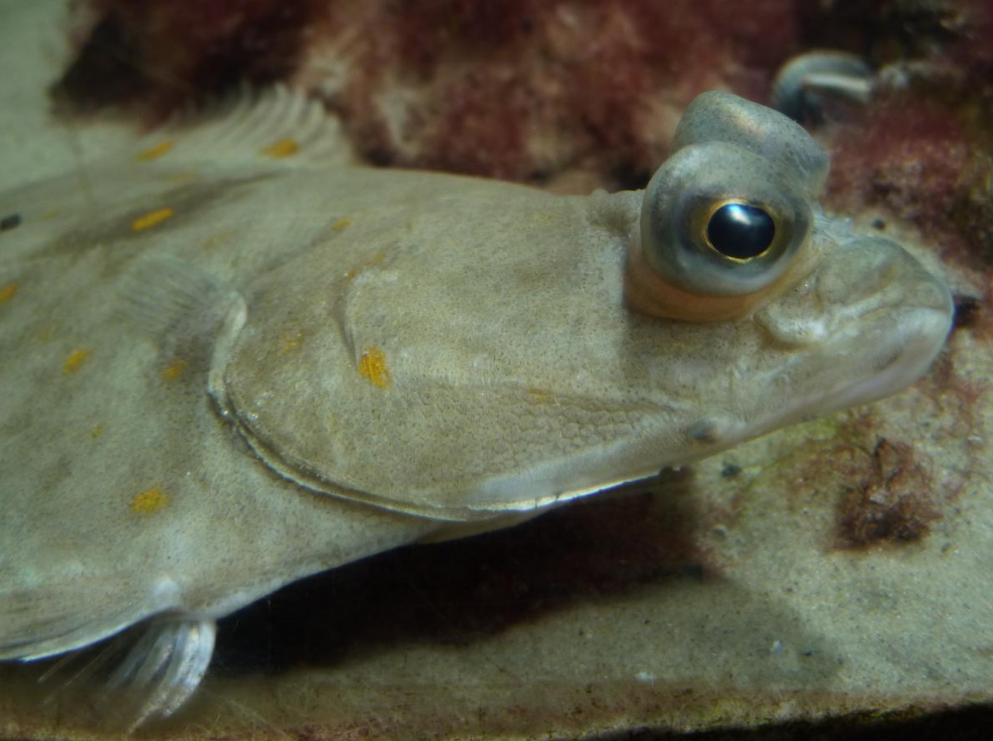 When the larvae of a flatfish grows, the eye on one side rotates to the other side so the fish can rest on the seafloor. https://handwiki.org/wiki/index.php?curid=1118625