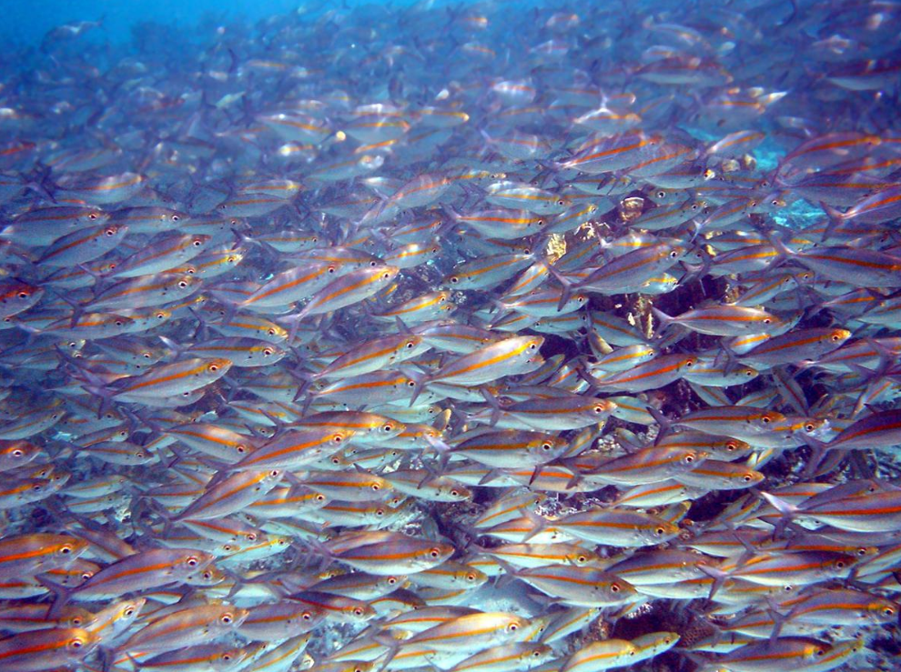 Small fish often school together for safety. This can have visual advantages, both by visually confusing predator fishes, and by providing many eyes for the school regarded as a body. The "predator confusion effect" is based on the idea that it becomes difficult for predators to pick out individual prey from groups because the many moving targets create a sensory overload of the predator's visual channel.[55] "Shoaling fish are the same size and silvery, so it is difficult for a visually oriented predator to pick an individual out of a mass of twisting, flashing fish and then have enough time to grab its prey before it disappears into the shoal."[56] The "many eyes effect" is based on the idea that as the size of the group increases, the task of scanning the environment for predators can be spread out over many individuals, a mass collaboration presumably providing a higher level of vigilance.[57][58]