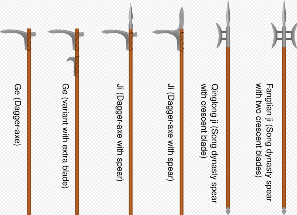 The ji (Chinese: 戟) was created by combining the dagger-axe with a spear. It was used as a military weapon at least as early as the Shang dynasty until the end of the Northern and Southern dynasties.