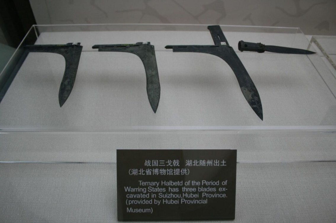 The dagger-axe, or gee (Chinese: 戈; pinyin: gē; Wade–Giles: ko; sometimes confusingly translated "halberd") is a type of weapon that was in use from Shang dynasty until at least Han dynasty China. It consists of a dagger-shaped blade made of bronze (or later iron) mounted by the tang to a perpendicular wooden shaft: a common Bronze Age infantry weapon, also used by charioteers. Some dagger axes include a spear-point. There is a (rare) variant type with a divided two-part head, consisting of the usual straight blade and a scythe-like blade. Other rarities include archaeology findings with two or sometimes three blades stacked in line on top of a pole, but were generally thought as ceremonial pole arms. Though the weapon saw frequent use in ancient China, the use of the dagger-axe decreased dramatically after the Qin and Han dynasties. The ji combines the dagger axe with a spear. By the post-classical Chinese dynasties, with the decline of chariot warfare, the use of the dagger-axe was almost nonexistent.