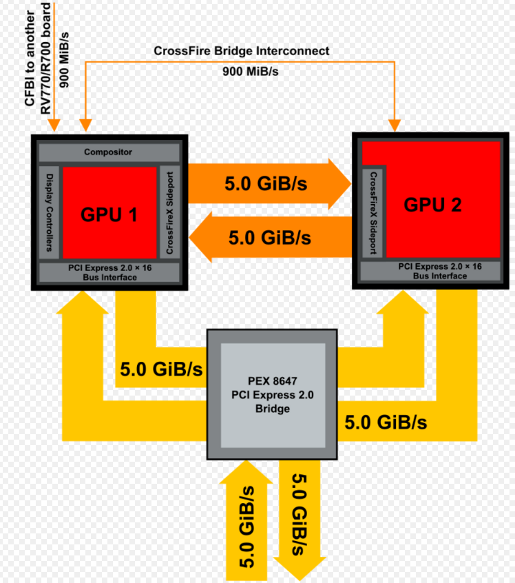 This generation of dual-GPU design retains the use of a PCI Express bridge, PLX PEX 8647 with a power dissipation of 3.8 watts inclusive of PCI Express 2.0 support, allowing two GPUs on the same PCI Express slot with doubled bandwidth over the past generation of product (Radeon HD 3870 X2). Subsequent generations of dual-GPU design also feature an interconnect for inter-GPU communications through the implementation of a CrossFire X SidePort on each GPU, giving extra 5 GB/s full-duplex inter-GPU bandwidth. These two features increase total bandwidth for dual-GPU designs to 21.8 GB/s.