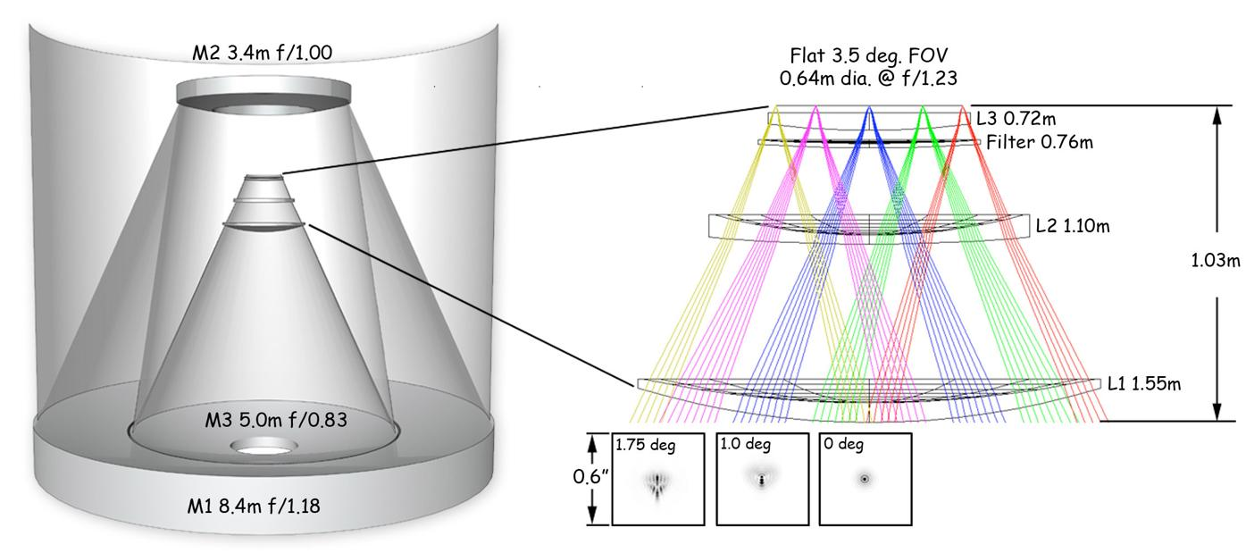 The optics includes three corrector lenses to reduce aberrations. These lenses, and the telescope's filters, are built into the camera assembly. The first lens at 1.55 m diameter is the largest lens ever built, and the third lens forms the vacuum window in front of the focal plane.