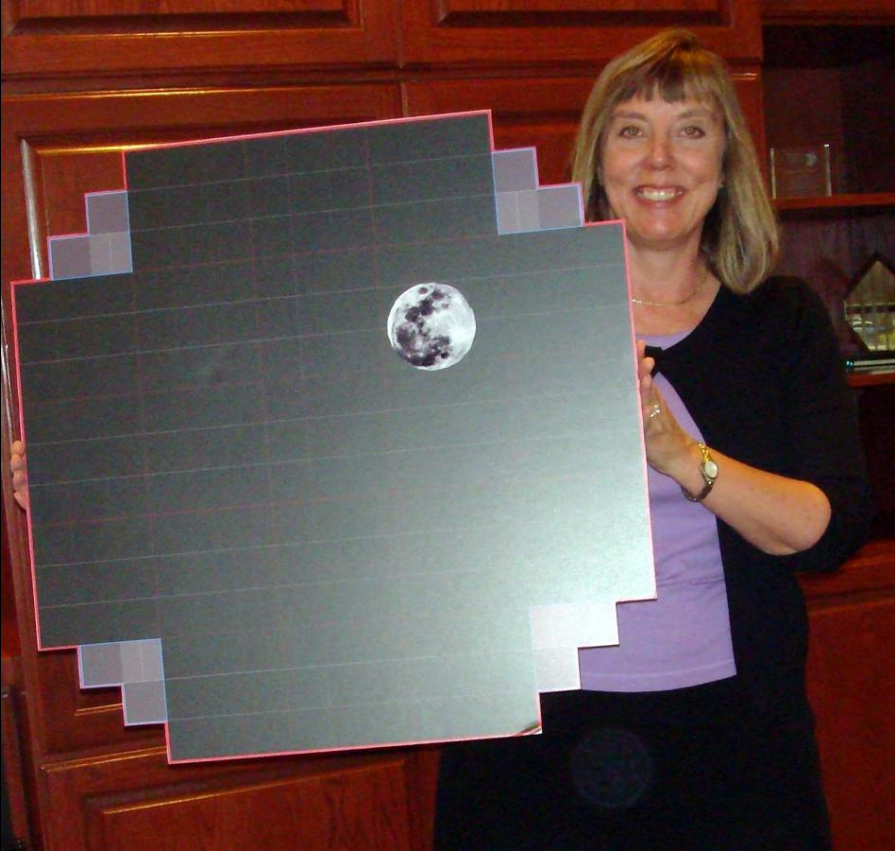 The camera focal plane is flat, 64 cm in diameter. The main imaging is performed by a mosaic of 189 CCD detectors each of 16 megapixels.[18] They are grouped into a 5×5 grid of "rafts", where the central 21 rafts contain 3×3 imaging sensors, while the four corner rafts contain only three CCDs each, for guiding and focus control. The CCDs provide better than 0.2 arcsecond sampling, and will be cooled to approx −100 °C.[19] to help reduce noise.