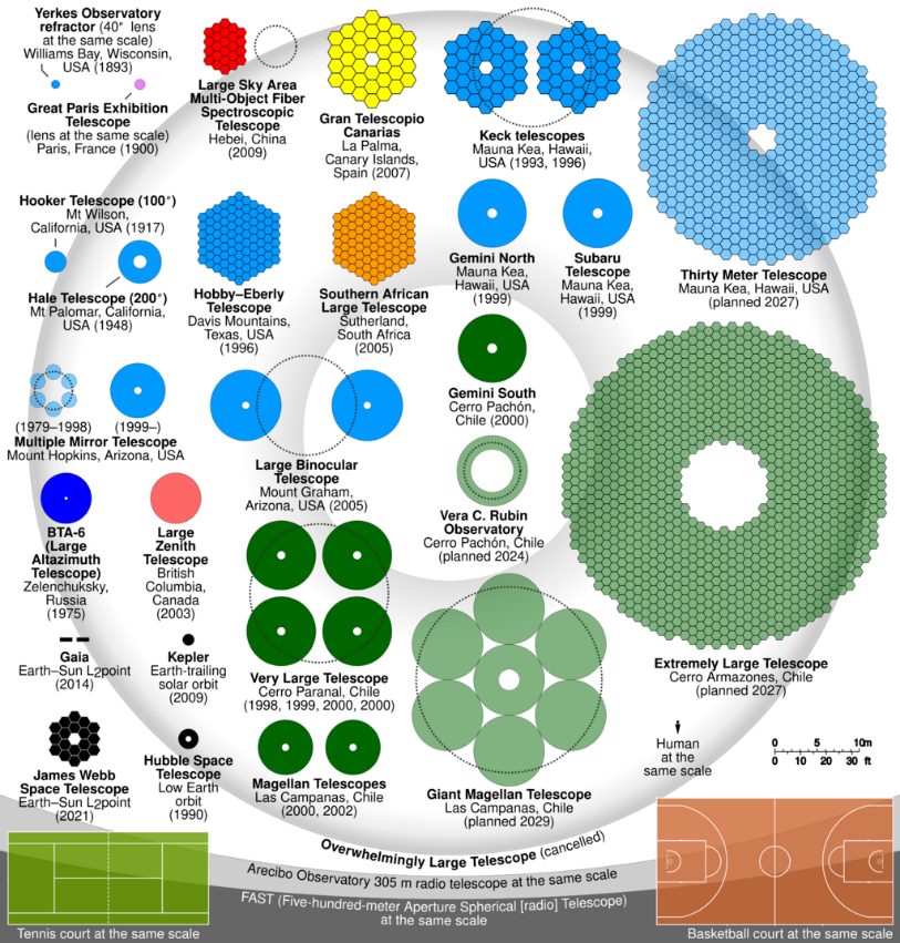 The LSST is the latest in a long line of improvements giving telescopes larger fields of view. The earliest reflecting telescopes used spherical mirrors, which although easy to fabricate and test, suffer from spherical aberration; a very long focal length was needed to reduce spherical aberration to a tolerable level. Making the primary mirror parabolic removes spherical aberration on-axis, but the field of view is then limited by off-axis coma. Such a parabolic primary, with either a prime or Cassegrain focus, was the most common optical design up through the Hale telescope in 1949. After that, telescopes used mostly the Ritchey–Chrétien design, which uses two hyperbolic mirrors to remove both spherical aberration and coma, leaving only astigmatism, giving a wider useful field of view. Most large telescopes since the Hale use this design—the Hubble and Keck telescopes are Ritchey–Chrétien, for example. LSST will use a three-mirror anastigmat to cancel astigmatism: three non-spherical mirrors. The result is sharp images over a very wide field of view, but at the expense of light-gathering power as the large second mirror blocks much of the aperture of the telescope.