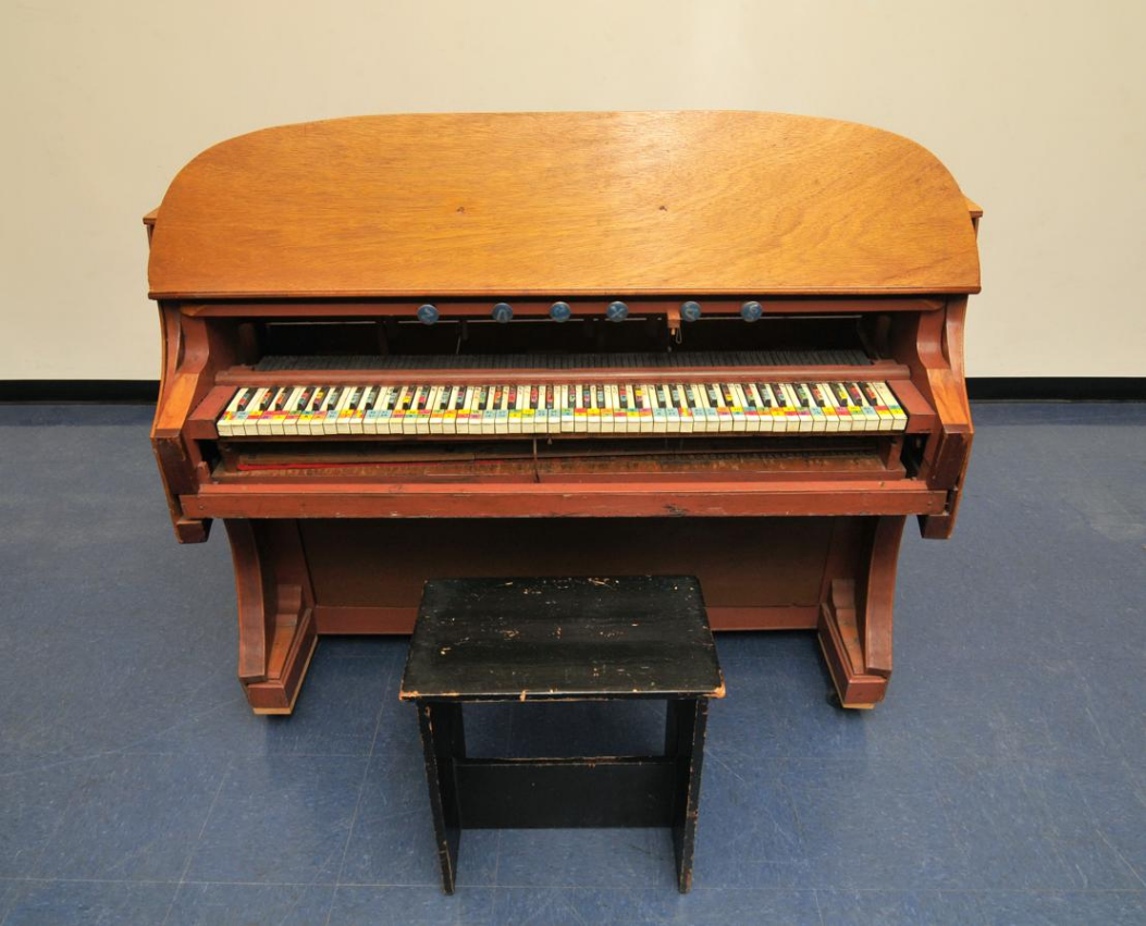 The Chromelodeons are pump organs modified by Partch to conform to his tonality system. Chromelodeon I was adapted in 1945 from a 73-key pump organ. Chromelodeon II was adapted in 1959 from an 88-key pump organ. Both keyboards have colored and numbered labels representing ratios of the tuning system.[8]