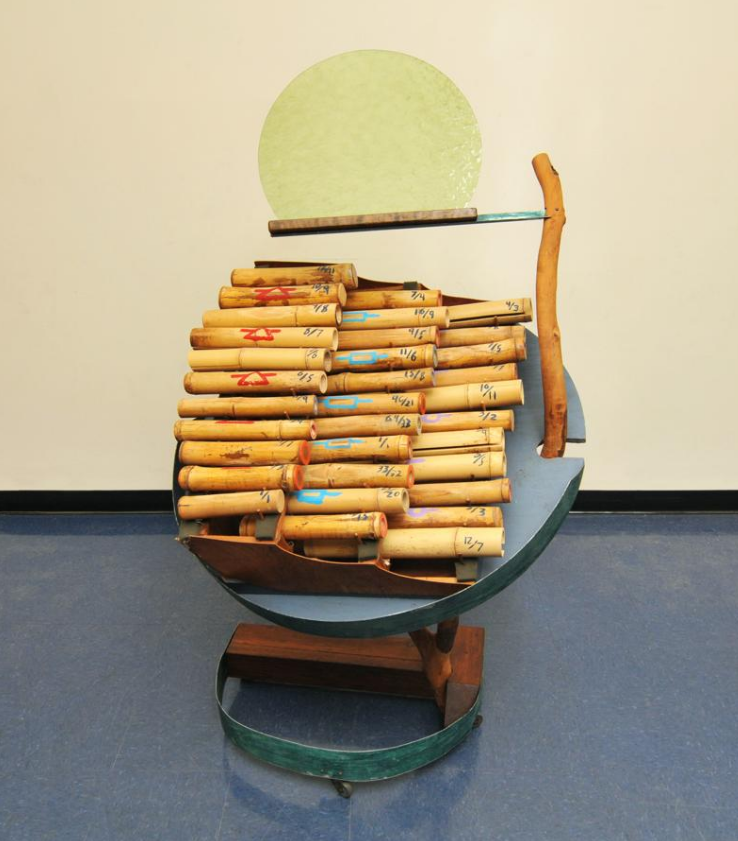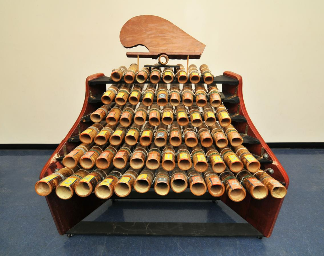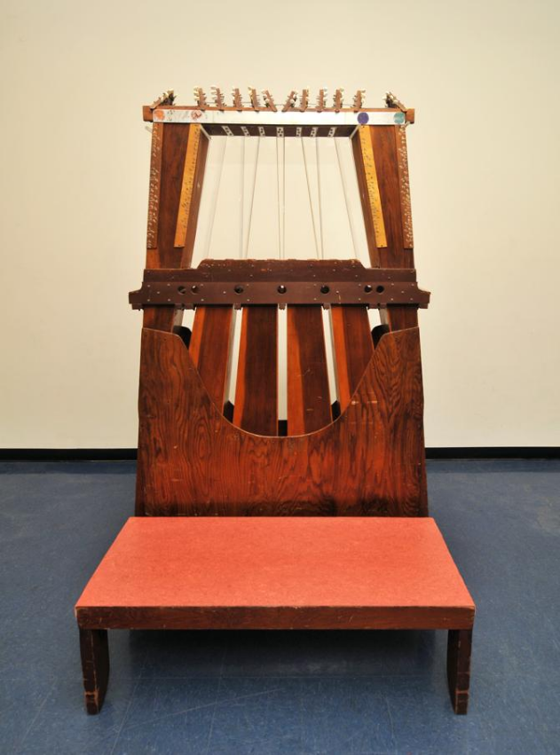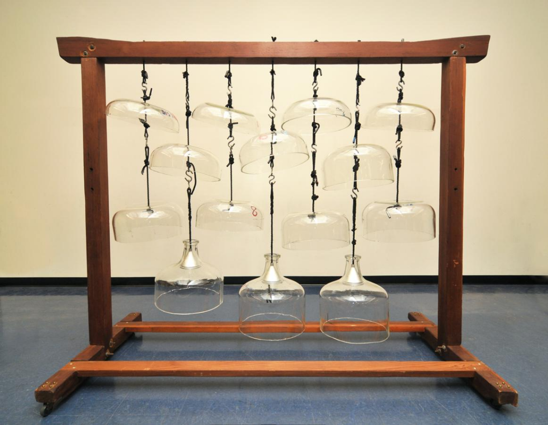 Twelve temple bells bolted to gourd resonators on a bar of eucalyptus, and two Douglas Aircraft bomber nosecones.[10] First built in 1964.[7]