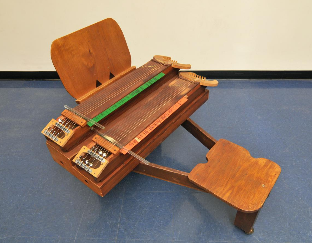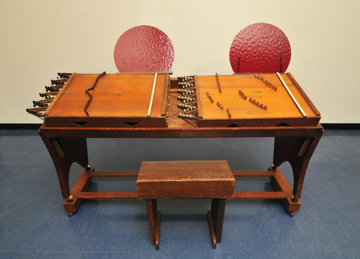 The Harmonic Canons (from the same root as qanún) are 44-stringed sonometer instruments with complex systems of movable bridges that were mostly positioned by Partch on harmonic nodal positions to get a just intoned harmonic relation between the left and right string part. They are tuned differently depending on the piece, and are played with fingers or picks, or in some cases, unique mallets.