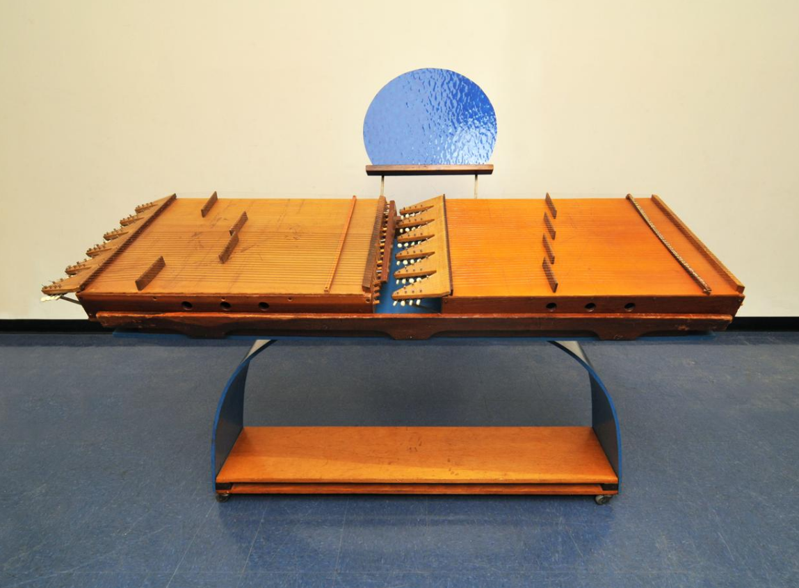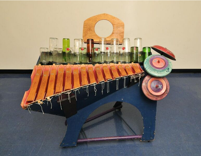 The Zymo-Xyl is an oak-block xylophone augmented with tuned liquor and wine bottles, Ford hubcaps, and an aluminum ketchup bottle. The name is from the Greek zymo- for "fermentation", and xylo- or xyl- for "wood".[15] First built in 1963.[7]