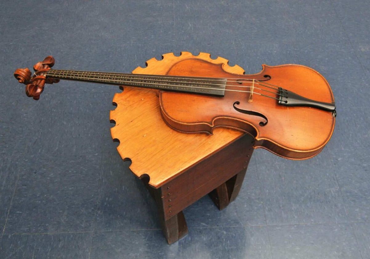 The Adapted Viola is the earliest extant instrument created by Partch. It is made from a cello fingerboard neck attached to the body of a viola.[2] It also includes a changeable bridge which allows triple stops, i.e. full triads, to be sustained.[3] Partch hammered brads into the fingerboard to aid with finding fingerings.[4] The Adapted Viola was constructed in New Orleans with the assistance of an Edward Benton, a local violin maker. Partch originally called it the Monophone, but by 1933 it had become known as the Adapted Viola.[2]