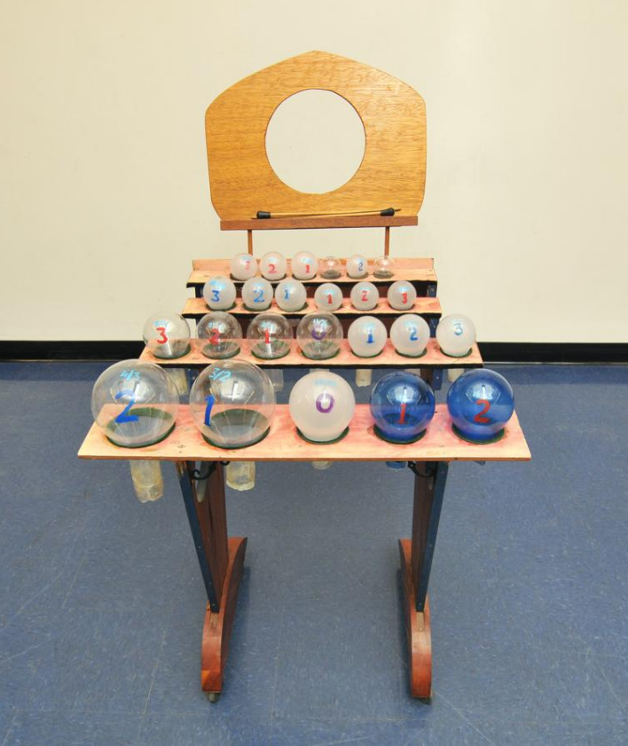 The Cloud-Chamber Bowls are a set of 12-US-gallon (45 L), 16-inch diameter Pyrex bowls cut from carboys, suspended in a frame. The carboys were originally sourced from the Berkeley Radiation Laboratory, where they were used in the construction of cloud chambers.({{{1}}}, {{{2}}})[8] It was first built in 1950.[7]