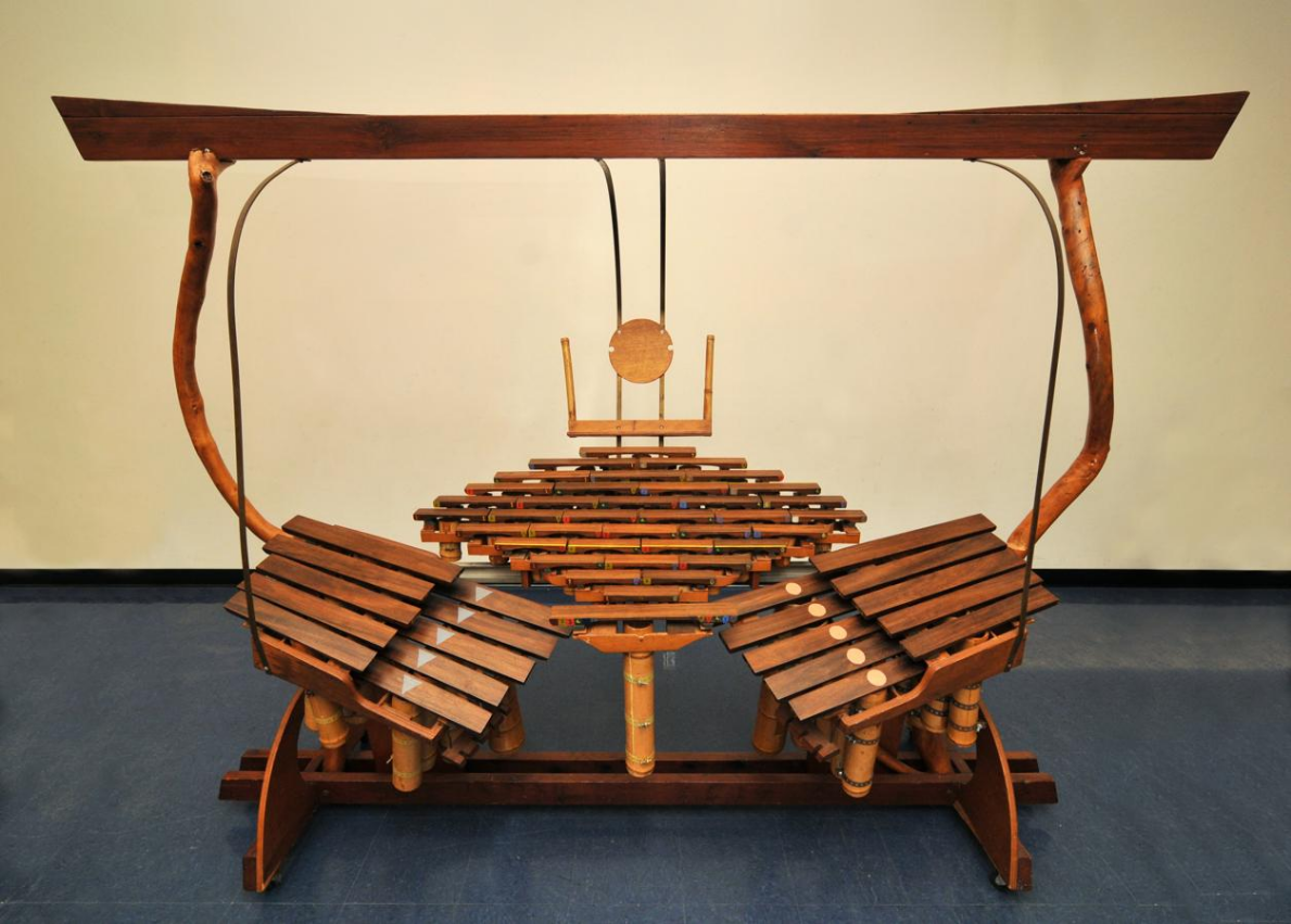 Nicknamed "Boo" and "Boo II", the Bamboo Marimbas are marimbas made of bamboo, using the concept of a tongued resonator to produce the tones.