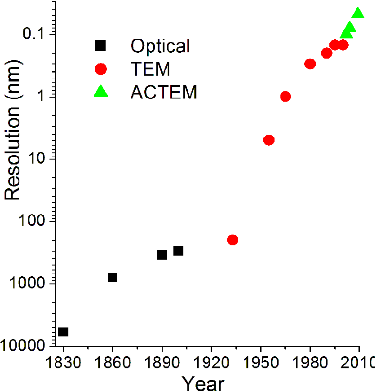 Optimal resolution in a TEM is achieved when spherical aberrations are corrected with objective lens. However, due to the geometry of most TEMs, inserting large in-situ holders requires the user to compromise the objective lens and endure spherical aberrations. Therefore, there is a compromise between the width of the pole-piece gap and spatial resolution below 0.1 nm. Research groups at various institutions have tried to overcome spherical aberrations through use of monochromators to achieve 0.05 nm resolution with a 5 mm pole piece gap.[77]