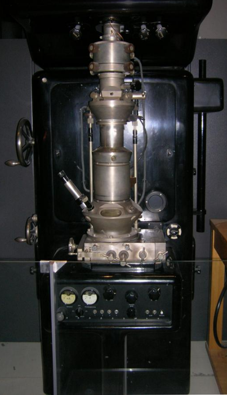 Research continued on the electron microscope at Siemens in 1936, where the aim of the research was the development and improvement of TEM imaging properties, particularly with regard to biological specimens. At this time electron microscopes were being fabricated for specific groups, such as the "EM1" device used at the UK National Physical Laboratory.[10] In 1939, the first commercial electron microscope, pictured, was installed in the Physics department of IG Farben-Werke. Further work on the electron microscope was hampered by the destruction of a new laboratory constructed at Siemens by an air raid, as well as the death of two of the researchers, Heinz Müller and Friedrick Krause during World War II.[11]