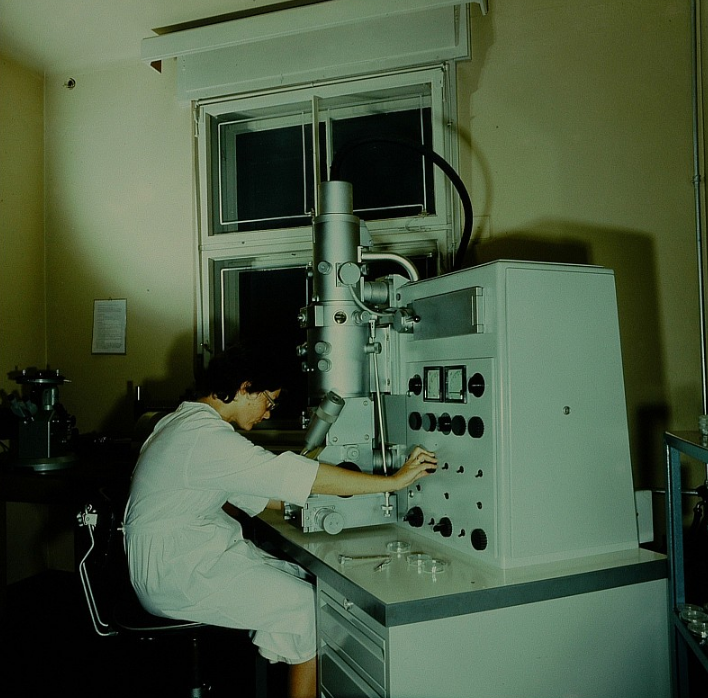 After World War II, Ruska resumed work at Siemens, where he continued to develop the electron microscope, producing the first microscope with 100k magnification.[11] The fundamental structure of this microscope design, with multi-stage beam preparation optics, is still used in modern microscopes. The worldwide electron microscopy community advanced with electron microscopes being manufactured in Manchester UK, the USA (RCA), Germany (Siemens) and Japan (JEOL). The first international conference in electron microscopy was in Delft in 1949, with more than one hundred attendees.[10] Later conferences included the "First" international conference in Paris, 1950 and then in London in 1954.