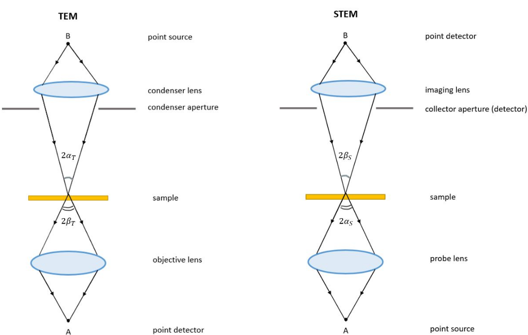 Fundamentally, TEM and STEM are linked via Helmholtz reciprocity. A STEM is a TEM in which the electron source and observation point have been switched relative to the direction of travel of the electron beam. See the ray diagrams in the figure on the right. The STEM instrument effectively relies on the same optical set-up as a TEM, but operates by flipping the direction of travel of the electrons (or reversing time) during operation of a TEM. Rather than using an aperture to control detected electrons, as in TEM, a STEM uses various detectors with collection angles that may be adjusted depending on which electrons the user wants to capture.