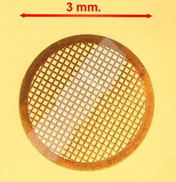 TEM specimen stage designs include airlocks to allow for insertion of the specimen holder into the vacuum with minimal loss of vacuum in other areas of the microscope. The specimen holders hold a standard size of sample grid or self-supporting specimen. Standard TEM grid sizes are 3.05 mm diameter, with a thickness and mesh size ranging from a few to 100 μm. The sample is placed onto the meshed area having a diameter of approximately 2.5 mm. Usual grid materials are copper, molybdenum, gold or platinum. This grid is placed into the sample holder, which is paired with the specimen stage. A wide variety of designs of stages and holders exist, depending upon the type of experiment being performed. In addition to 3.05 mm grids, 2.3 mm grids are sometimes, if rarely, used. These grids were particularly used in the mineral sciences where a large degree of tilt can be required and where specimen material may be extremely rare. Electron transparent specimens have a thickness usually less than 100 nm, but this value depends on the accelerating voltage.