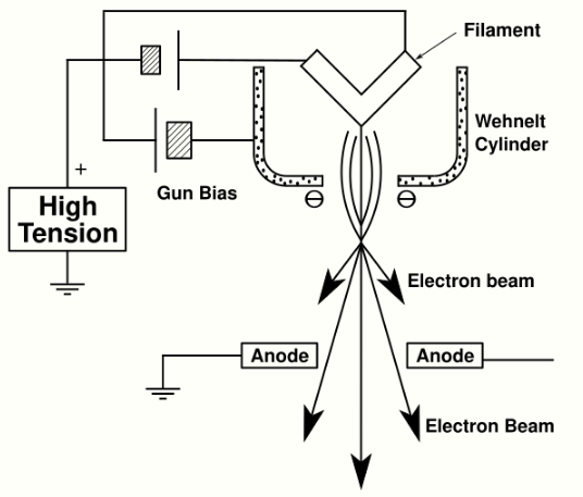 The electron gun is formed from several components: the filament, a biasing circuit, a Wehnelt cap, and an extraction anode. By connecting the filament to the negative component power supply, electrons can be "pumped" from the electron gun to the anode plate and the TEM column, thus completing the circuit. The gun is designed to create a beam of electrons exiting from the assembly at some given angle, known as the gun divergence semi-angle, α. By constructing the Wehnelt cylinder such that it has a higher negative charge than the filament itself, electrons that exit the filament in a diverging manner are, under proper operation, forced into a converging pattern the minimum size of which is the gun crossover diameter.