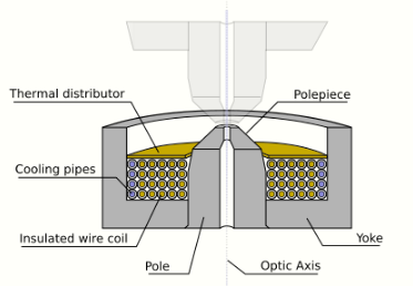 The coils which produce the magnetic field are located within the lens yoke. The coils can contain a variable current, but typically use high voltages, and therefore require significant insulation in order to prevent short-circuiting the lens components. Thermal distributors are placed to ensure the extraction of the heat generated by the energy lost to resistance of the coil windings. The windings may be water-cooled, using a chilled water supply in order to facilitate the removal of the high thermal duty.