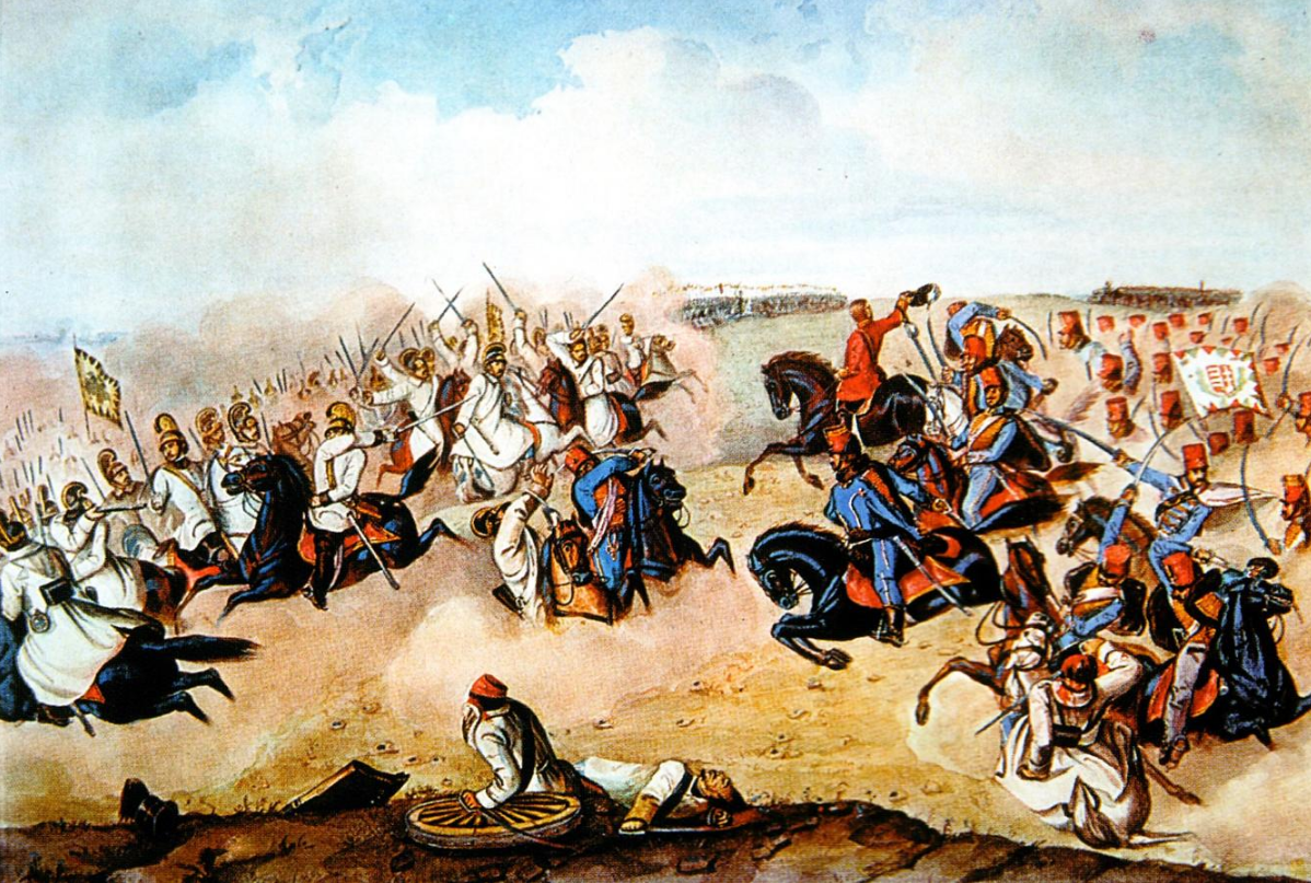 The revolution grew into a war for independence from the Habsburg Monarchy when Josip Jelačić, Ban of Croatia, crossed the border to restore their control.[31] The new government, led by Lajos Kossuth, was initially successful against the Habsburg forces. Although Hungary took a national united stand for its freedom, some minorities of the Kingdom of Hungary, including the Serbs of Vojvodina, the Romanians of Transylvania and some Slovaks of Upper Hungary supported the Habsburg Emperor and fought against the Hungarian Revolutionary Army. Eventually, after one and a half years of fighting, the revolution was crushed when Russian Tsar Nicholas I marched into Hungary with over 300,000 troops.[32] As result of the defeat, Hungary was thus placed under brutal martial law. The leading rebels like Kossuth fled into exile or were executed. In the long run, the passive resistance following the revolution, along with the crushing Austrian defeat in the 1866 Austro-Prussian War, led to the Austro-Hungarian Compromise (1867), which marked the birth of the Austro-Hungarian Empire.