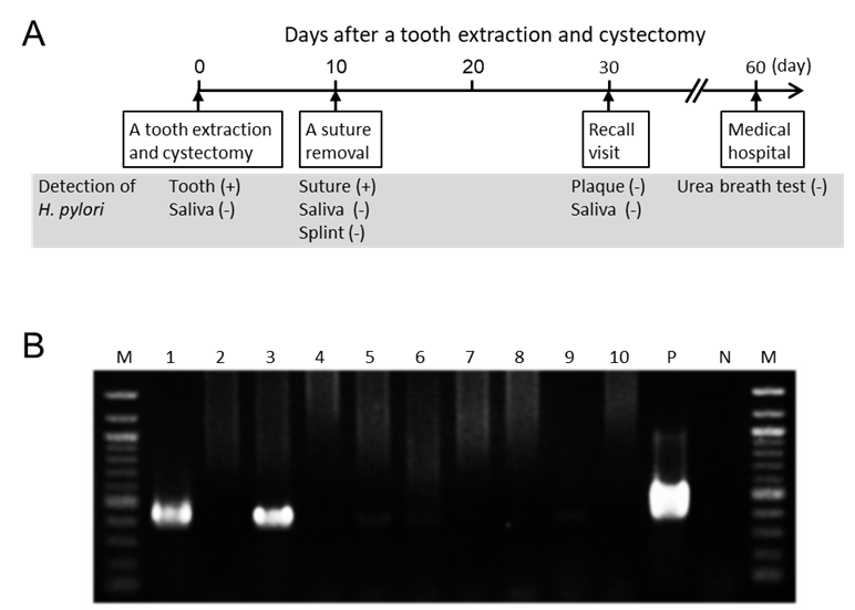 Figure 3. Detection of Helicobacter pylori in oral samples. (A) Time course of the present case after tooth extraction and cystectomy. (B) Polymerase chain reaction results for detection of H. pylori in oral samples. Lanes: 1, Extracted tooth; 2, Saliva taken immediately preoperatively; 3, Suture taken 10 days postoperatively; 4, Saliva taken 10 days postoperatively; 5, Splint taken 10 days postoperatively; 6, Dental plaque (upper left second premolar) taken 30 days postoperatively; 7, Dental plaque (lower left second premolar) taken 30 days postoperatively; 8, Dental plaque (lower right second premolar) taken 30 days postoperatively; 9, Dental plaque (lower right second molar) taken 30 days postoperatively; 10, Saliva taken 30 days postoperatively; P (positive control), H. pylori ATCC 43504; N (negative control), sterile water; M, 100-bp DNA ladder.