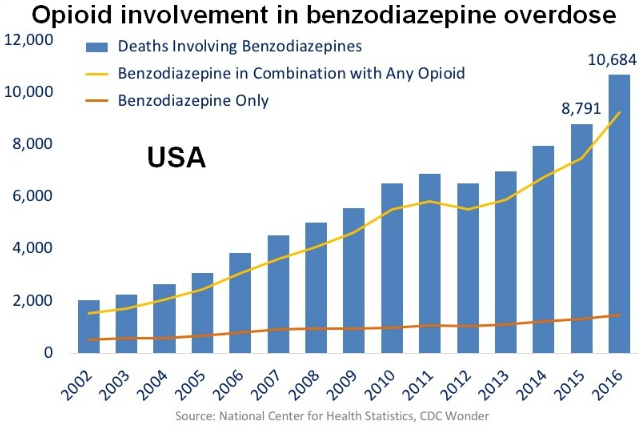 Etizolam overdose deaths are rising - for instance, the National Records of Scotland report on drug-related deaths, implicated 548 deaths from 'street' Etizolam in 2018, almost double the number from 2017 (299) and only six years from the first recorded death (in 2012). The 548 deaths were 45% of all drug-related deaths in Scotland in 2018.[52]