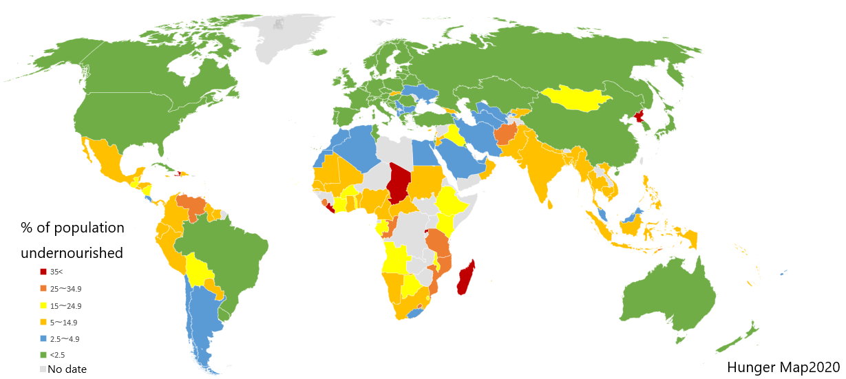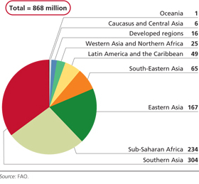 With its prevalence of undernourishment (PoU) indicator, the FAO reported that almost 870 million people were chronically undernourished in the years 2010–2012. This represents 12.5% of the global population, or 1 in 8 people. The 2018 prevalence of food insecurity declined, for the first time, to the pre-recession(2007) level of 11.1 percent.[15] Higher rates occur in developing countries, where 852 million people (about 15% of the population) are chronically undernourished. The report noted that Asia and Latin America have achieved reductions in rates of undernourishment that put these regions on track for achieving the Millennium Development Goal of halving the prevalence of undernourishment by 2015.[11] The UN noted that about 2 billion people do not consume a sufficient amount of vitamins and minerals.[16] In India, the second-most populous country in the world, 30 million people have been added to the ranks of the hungry since the mid-1990s and 46% of children are underweight.[17]