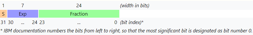 A single-precision binary floating-point number (called "short" by IBM) is stored in a 32-bit word: