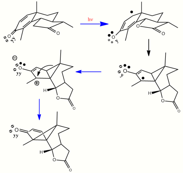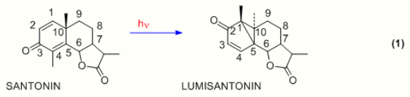 One of the earliest photochemical studies dealt with the natural product santonin. In the 19th century it had been observed by Ciamician that in Italian sunlight santonin gave several photoproducts.[1][2] The structure of santonin was first correctly described by Clemo and Hayworth in 1929.[3] The initial photoproduct obtained from santonin is lumisantonin.[4] As depicted in Eqn. 1, the photoreaction involves a rearrangement. Using steroid numbering, we note that the C-3 carbonyl group has moved to C-2, the C-4 methyl has moved to C-1, and the C-10 carbon has been inverted.