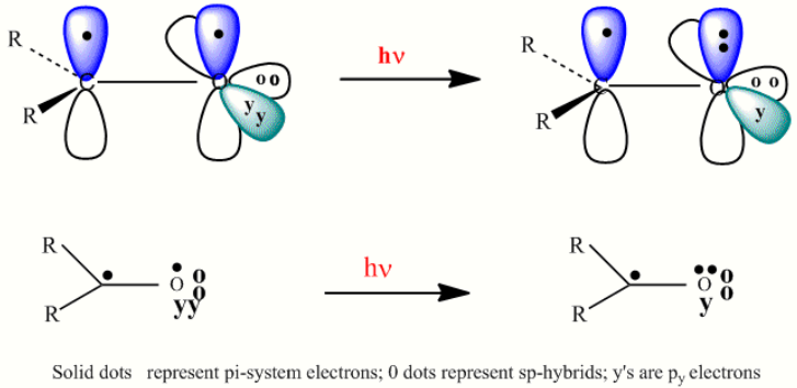 Starting in 1961 it was found that one could understand organic photochemical reactions in the context of the relevant excited states.[6][7][8] One example is the n-pi* excitation of mono-carbonyl compounds, the simplest being that of formaldehyde. The structure was first described by Mulliken.[9] The three-dimensional representation (top drawing) is simplified in the second line using a two-dimensional representation, which facilitates arrow pushing.[7][8]