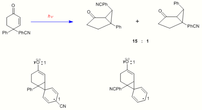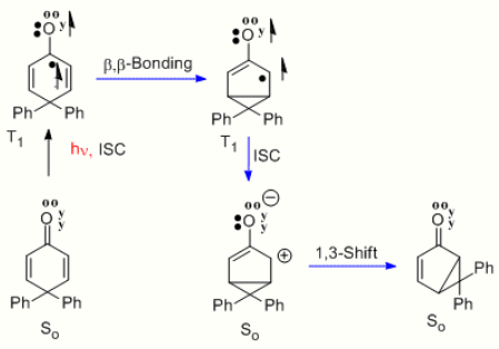 Quite parallel to the santonin to lumisantonin example is the rearrangement of 4,4-diphenylcyclohexadienone[8] Here the n-pi* triplet excited state undergoes the same beta-beta bonding. This is followed by intersystem crossing (i.e. ISC) to form the singlet ground state which is seen to be a zwitterion. The final step is the rearrangement to the bicyclic photoproduct. The reaction is termed the type A cyclohexadienone rearrangement.