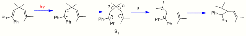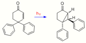 Still another type of photochemical reaction is the di-pi-methane rearrangement.[12] Two further early examples were the rearrangement of 1,1,5,5-tetraphenyl-3,3-dimethyl-1,4-pentadiene (the "Mariano" molecule)[13] and the rearrangement of barrelene to semibullvalene.[14] We note that, in contrast to the cyclohexadienone reactions which used n-π* excited states, the di-π-methane rearrangements utilize π-π* excited states.