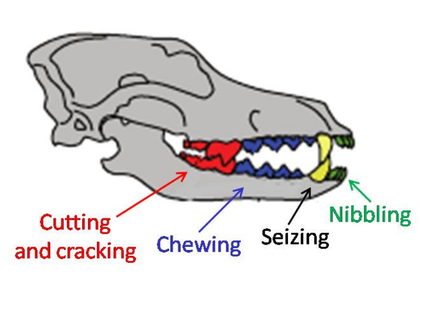 In comparison to other gray wolves, megafaunal wolf samples include many more individuals with moderately to heavily worn teeth, and significantly greater numbers of broken teeth. The distribution of fractures across the tooth row differs as well, with these wolves having much higher fracture frequencies of incisors, carnassials, and molars. A similar pattern was observed in spotted hyenas, suggesting that increased incisor and carnassial fracture reflects habitual bone consumption, because bones are gnawed with incisors and subsequently cracked with the cheek teeth.[1]:1148