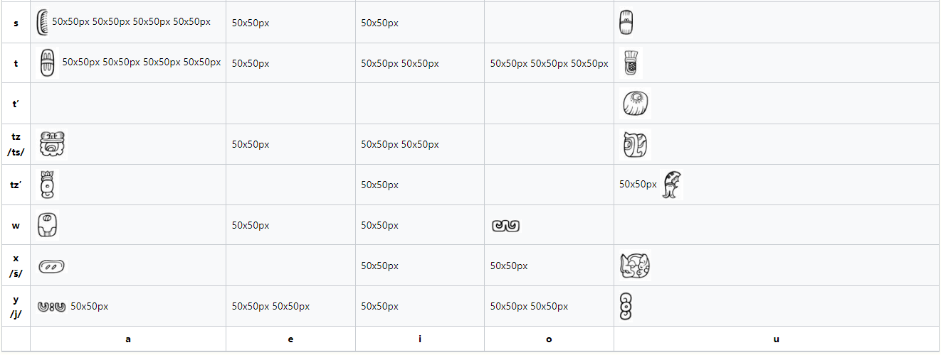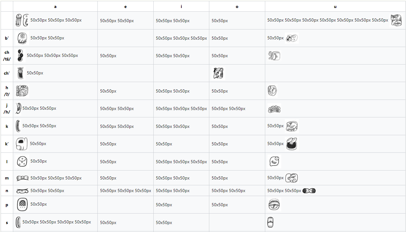 Over 90 percent of the Maya texts can now be read with reasonable accuracy.[29] (As of 2020), at least one phonetic glyph was known for each of the syllables marked green in this chart. /tʼ/ is rare. Based on verbal inflection patterns, it would seem that a syllabogram for /wu/ did not exist rather than simply being unattested.[30] /pʼ/ is not found, and is thought to have been a later innovation in the Cholan and Yucatec languages.