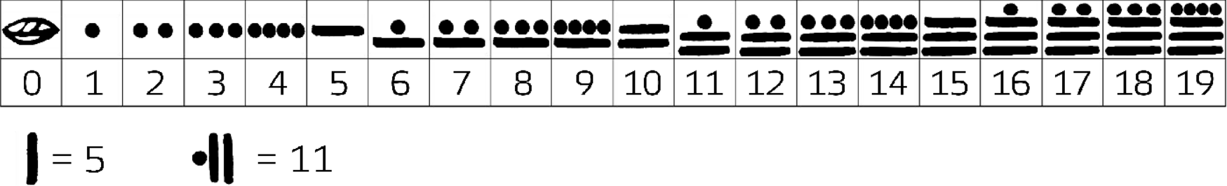 The Mayas used a positional base-twenty (vigesimal) numerical system which only included whole numbers. For simple counting operations, a bar and dot notation was used. The dot represents 1 and the bar represents 5. A shell was used to represent zero. Numbers from 6 to 19 are formed combining bars and dots, and can be written horizontally or vertically.