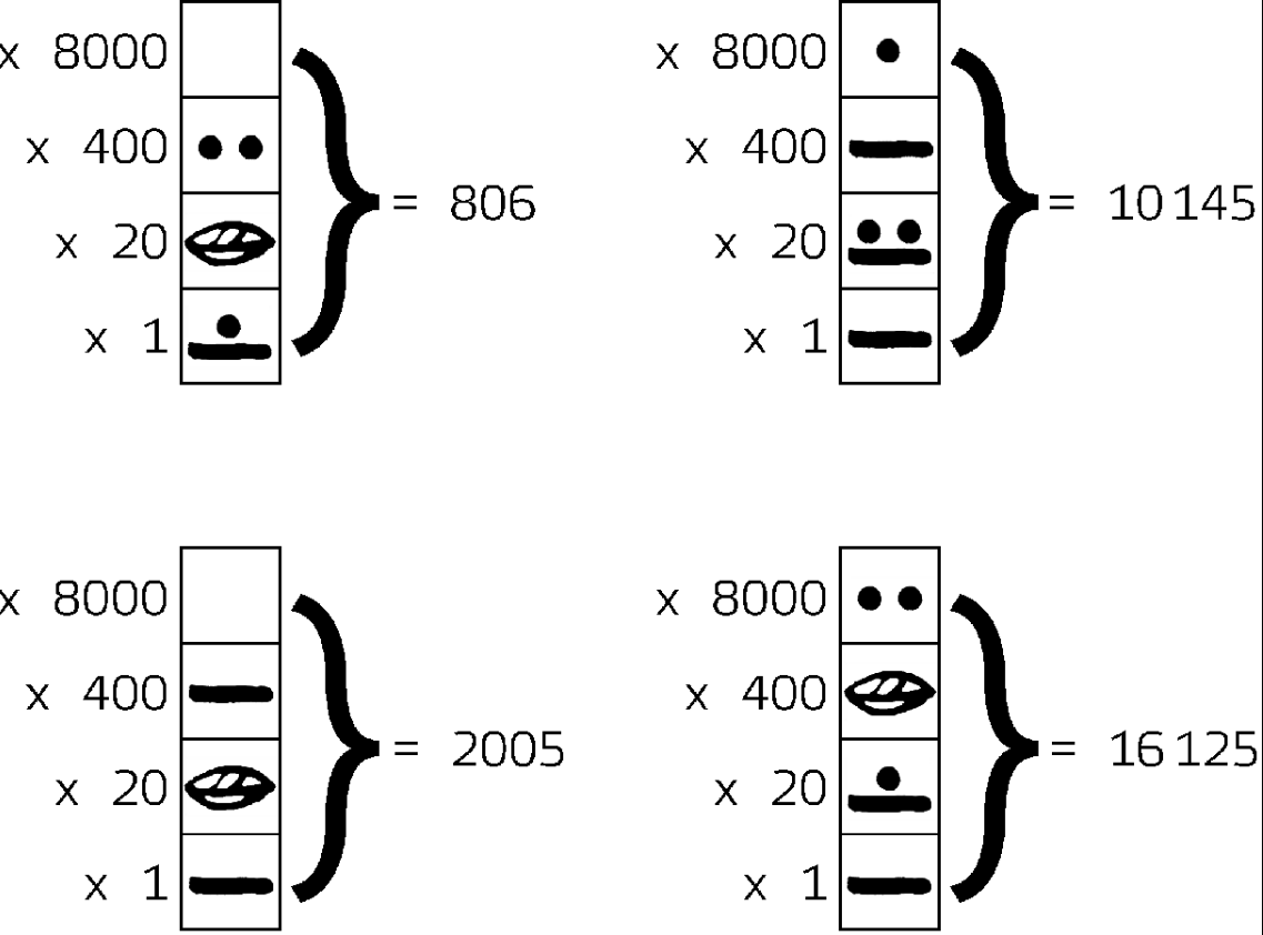 Numbers over 19 are written vertically and read from the bottom to the top as powers of 20. The bottom number represents numbers from 0 to 20, so the symbol shown does not need to be multiplied. The second line from the bottom represents the amount of 20s there are, so that number is multiplied by 20. The third line from the bottom represents the amount of 400s, so it's multiplied by 400; the fourth by 8000; the fifth by 160,000, etc. Each successive line is an additional power of twenty (similar to how in Arabic numerals, additional powers of 10 are added to the right of the first digit). This positional system allows the calculation of large figures, necessary for chronology and astronomy.[13]